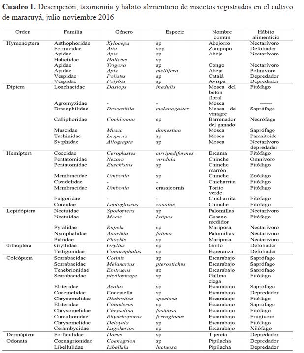 La mayor abundancia y riqueza de insectos asociados al cultivo de maracuyá, ocurrió en la finca Las Vegas. En cuanto a la riqueza de insectos se encontraron 36 familias, con 44 géneros, siendo los más numerosos los pertenecientes a las familias Apidae, Vespidae, Noctuidae, Pentatomidae y Scarabaeidae. En la distribución temporal, las familias más importantes fueron, las Lonchaeidae, Anthophoridae, Coccidae y Formicidae.