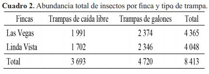 Abundancia total de insectos por tipo de trampa. En el Cuadro 2, se presenta la abundancia total de insectos El total de insectos en ambas fincas fue de 8 413, siendo la finca Las Vegas la que presentó mayor número de insectos, en las trampas de caída libre fue de 1 991 insectos, y en trampas de galones fue 2 374, mientras que en la finca Linda Vista en trampas de caída libre fue de 1 702 insectos, y en galones 2 346 en total, siendo mejor las trampas de galones que capturaron más insectos debido a que probablemente es porque la melaza es un atrayente para los insectos voladores, ya que el olor y el sabor dulce es apetecido para estos.