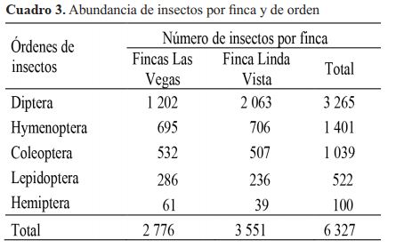 Abundancia de insectos por tipo de orden. Los principales ordenes de insectos encontrados fueron Díptera, Hymenoptera, Coleóptera, Lepidóptera y Hemíptera (Cuadro 3). Al comparar la abundancia de estos cinco órdenes de insectos, se observó que existió mayor cantidad de insectos por orden en la finca Las Vegas con tres órdenes y solo dos órdenes en la finca Linda Vista. El total de insectos encontrados por cada orden, en la finca Las Vegas fue Diptera con 1 202, Hymenoptera 695, Coleóptera 532, Lepidoptera 286 y Hemiptera 61, mientras el número de insectos por orden en la finca Linda Vista fue para Diptera de 2 063, Hymenoptera 706, Coleoptera 507, Lepidoptera 236 y Hemiptera con 39 insectos, el orden con mayor cantidad de insectos presentados fue el Diptera.