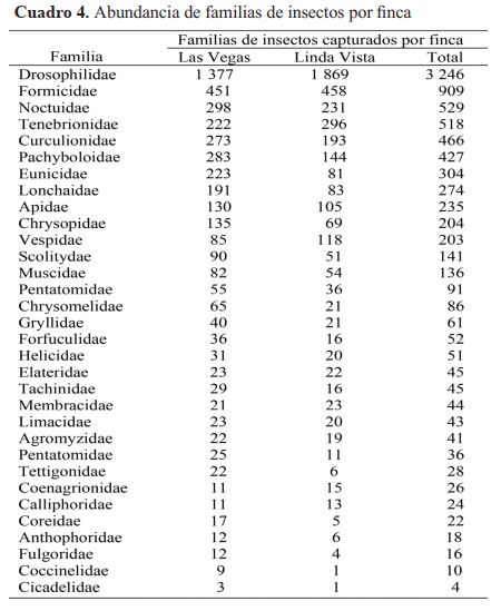 Se identificó un total de 80 familias de insectos, siendo las dos familias más dominantes Drosophilidae y la Formicidae en la finca Linda Vista, aunque de manera general la mayor dominancia fue para la finca Las Vegas.