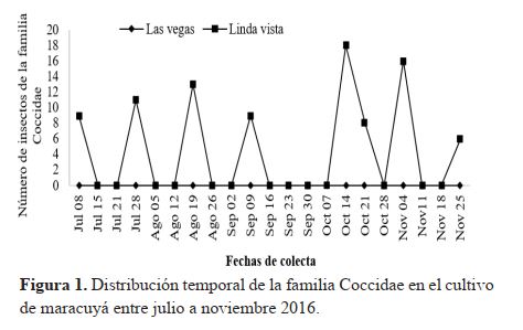 Distribución temporal de la familia Coccidae. Se muestra la distribución temporal de insectos de la familia Coccidae en ambas fincas, desde el 8 de julio hasta el 25 de noviembre (Figura, 1), registrándose insectos de esta familia solo en Linda Vista, en ocho de 21 fecha de colecta, los mayores picos poblacionales fueron el 19 de agosto con 13 insectos, 14 de octubre 18 insectos y el 4 de noviembre 16 insectos colectados. Se puede especular que la variación temporal de esta familia en la finca Linda Vista se vio debido a la edad del cultivo ya que estaba terminando su ciclo productivo y probablemente por existir debilitamiento en las plantas, ademas no se realizaba deshoje debido a que la enramada estaba cubierta totalmente, esto la convirtió más apetecida por las escamas de cera al encontrar las condiciones para alimentarse y reproducirse.