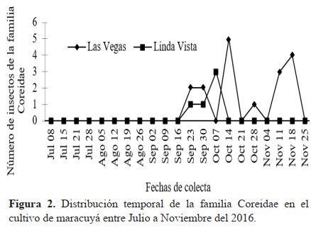 Distribución temporal de la familia Coreidae.Se registró mayor población de insectos de esta familia fue en la finca Las Vegas en seis de 21 fechas de colecta, en comparación con la finca Linda Vista donde se encontró en tres de 21 fechas de colectas. Las fechas que presentaron los mayores picos poblacionales en la finca Las Vegas fue el 14 de octubre con cinco insectos, el 11 de noviembre tres insectos y el 18 de noviembre cuatro insectos, mientras que en la finca Linda Vista los mayores picos poblacionales fueron el 23 de septiembre con dos insectos y el 30 se septiembre con dos insectos colectados.