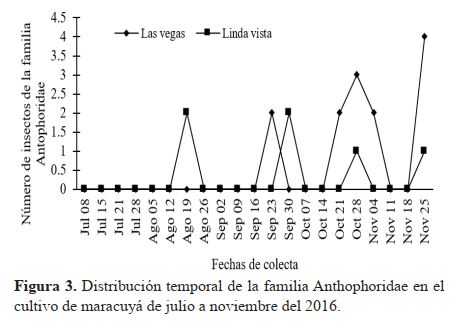 Distribución temporal de la familia Anthophoridae. Existió mayor población de insectos de esta familia en la finca Las Vegas en cinco de las 21 fechas de colecta, en comparación con la finca Linda Vista con solo 4 de 21 fechas de colecta, los mayores picos poblacionales en la finca Linda Vista fueron el 23 de septiembre con dos insectos, el 21 de octubre dos insectos, el 28 de octubre tres insectos, el 4 de noviembre dos insectos y el 25 de noviembre cuatro insectos, fueron el 19 de agosto con dos insectos y el 30 de septiembre dos insectos colectados.