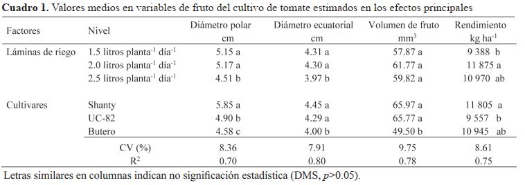 study three irrigation sheets (T1=1.5, T2= 2.0 and T3= 2.5 liters plant-1 day-1) in three tomato cultivars (Shanty, UC-82 and Butero) in soils