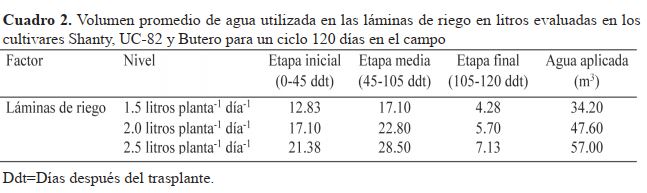 2.0 litros planta-1 día-1 (11 875 kg ha-1) y 2.5 litros planta-1 día-1 (10