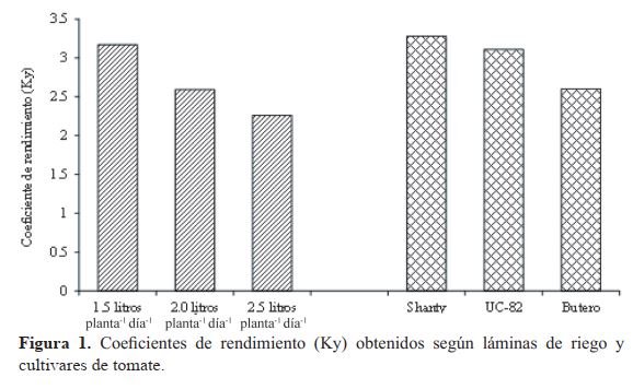 Coeficiente de rendimiento del cultivo Ky. Considerando los factores evaluados (láminas de riego y cultivares de tomate), la lámina de riego con menor pérdida en el rendimiento fue de 2.5 litros planta-1 día-1 con un Ky de 2.26 registrando mayor pérdida la lámina de 1.5 litros planta-1 día-1 con un Ky de 3.17 (Figura 1). El cultivar que presentó la mayor pérdida fue Shanty (3.28) y con un menor Ky Butero (2.60). Esta diferencia se debe a la cantidad de agua aplicada. |