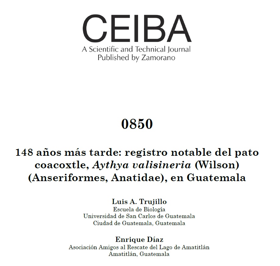 Núm. 0850 (2021): 148 años más tarde: registro notable del pato coacoxtle, Aythya valisineria (Wilson) (Anseriformes, Anatidae), en Guatemala