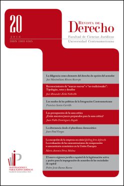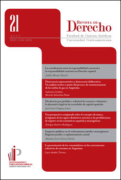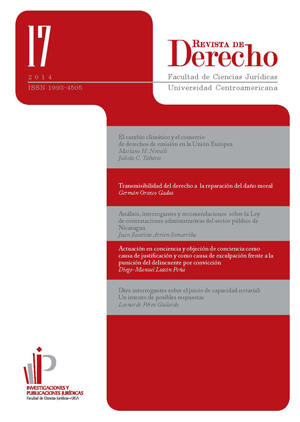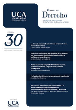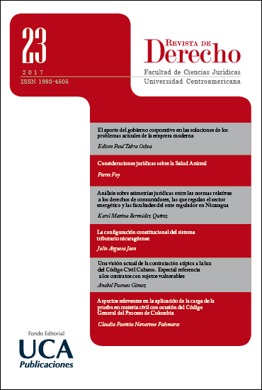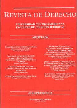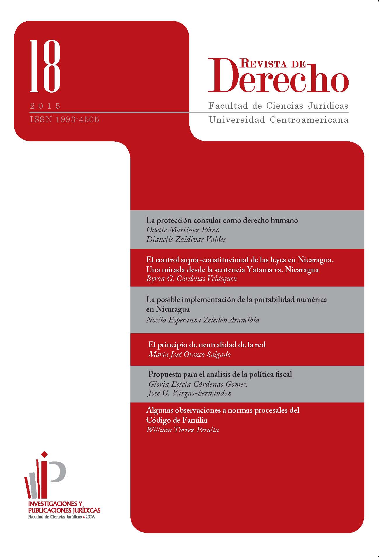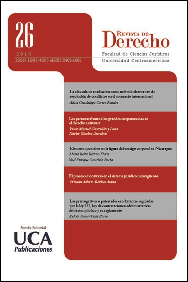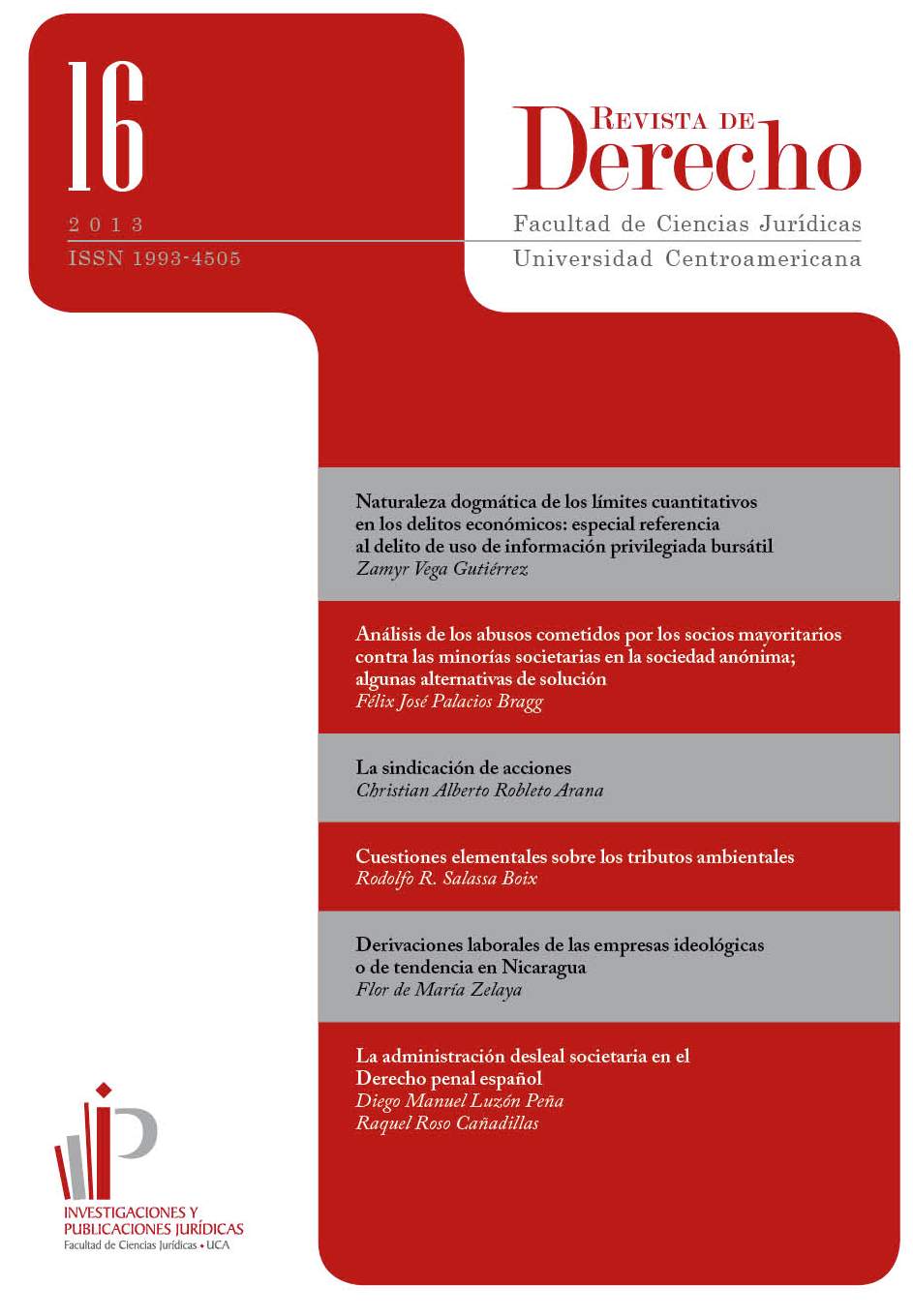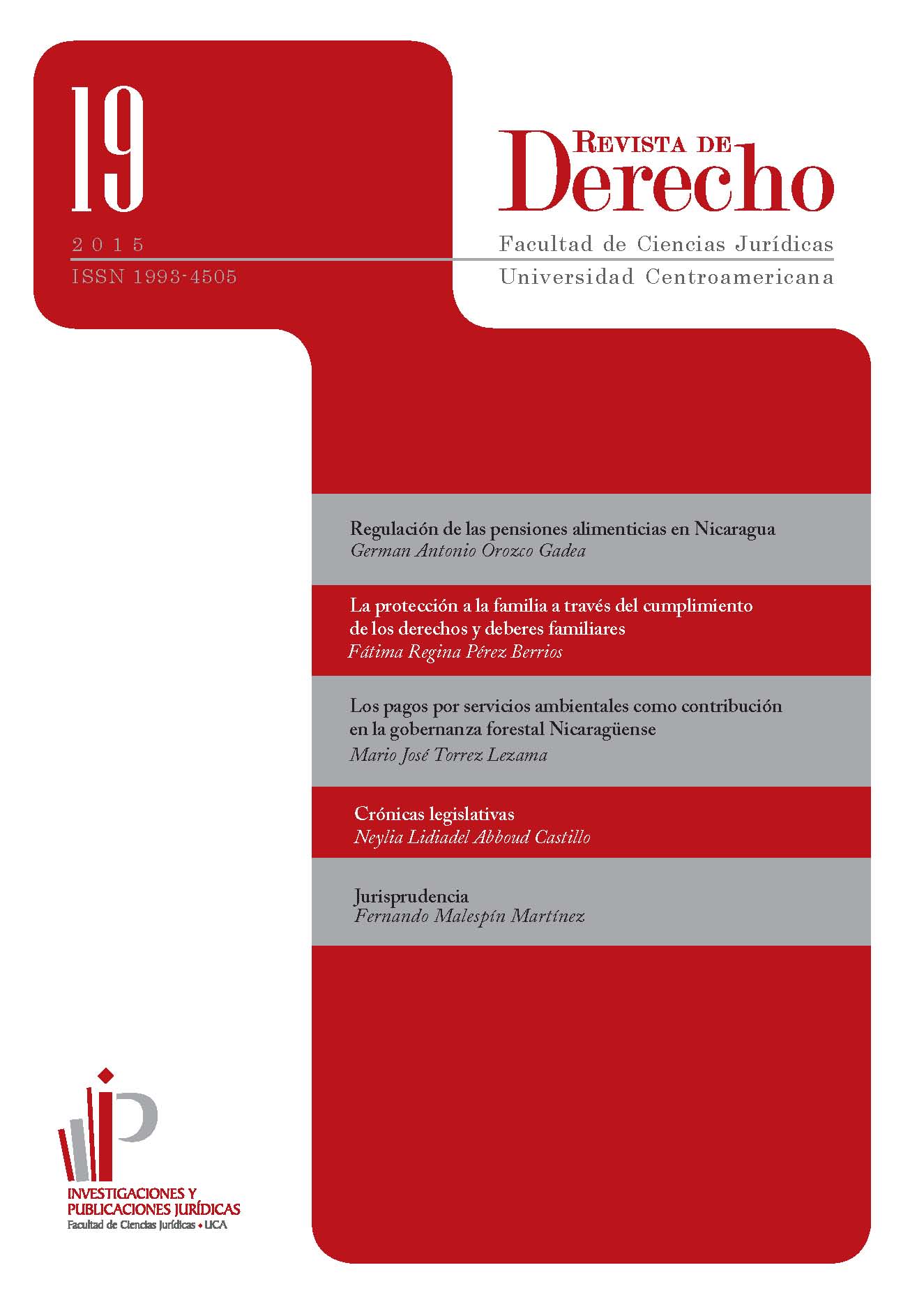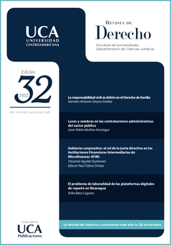 Revista de Derecho. ISSN electrónico: 2409-1685. ISSN físico: 1993-4505 Editada y publicada por el Departamento de Ciencias Jurídicas de la Facultad de Humanidades de la Universidad Centroamericana (Managua, Nicaragua). Rotonda Rubén Darío 150 metros al oeste. Apartado Postal 69
