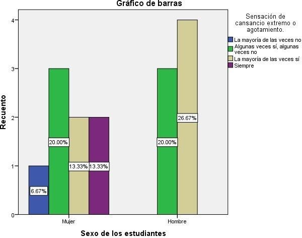 Gráfico N° 1. Cruce de la variable sexo y el ítem de la escala Likert sensación de cansancio extremo o agotamiento.