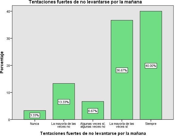Como se refleja en la gráfica el (40,00%) de los pre internos presentan tentaciones fuertes de no levantarse por la mañana, seguido de un (36,67%) que expresan que la mayoría de las veces tienen tentaciones fuertes de no levantarse por la mañana, un (13,33%) dicen que la mayoría de las veces no presentan tentaciones fuertes de no levantarse por la mañana y un (3,33%) dicen nunca a ver sentido esas tentaciones de no levantarse por la mañana.