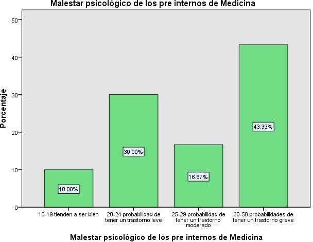 En el gráfico de malestar psicológico de los pre internos de Medicina un (43,33%) están entre las probabilidades de tener un trastorno grave, seguido de un (30,00%) que están en las probabilidades de tener un trastorno leve, un (16,67%) tienen la probabilidad de tener un trastorno moderado y un (10,00%) tienden a ser bien.
