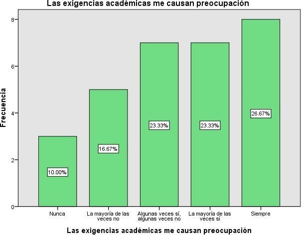 En el gráfico, las exigencias académicas me causan preocupación el (26,67%) manifiestan que siempre, algunas veces sí, algunas veces no y la mayoría de las veces sí, se reflejan con un (23,33%), un (16,67%) reflejan que la mayoría de las veces no y un (10,00%) nunca.