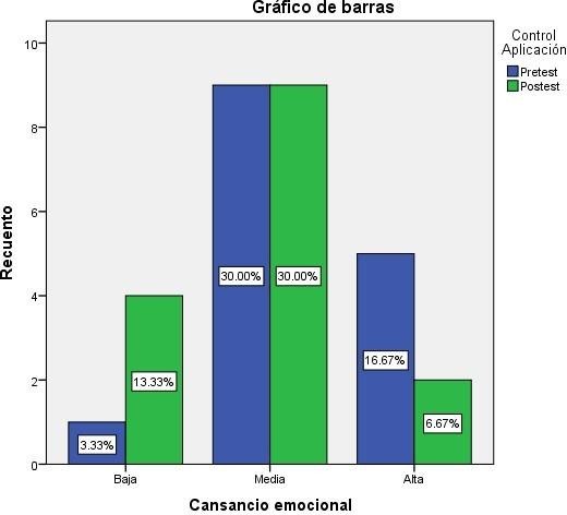 Durante el pretest se encontró que el (30,00%) se encontraban en el nivel medio de cansancio emocional. Posterior a la intervención se mantuvo con el mismo porcentaje, lo que indica que no hubo disminución. Mientras que en el nivel alto se presentó una disminución de (16,67%) a un (6,67%) y en el nivel bajo hubo un incremento del (3.33%) al (13,33%).
