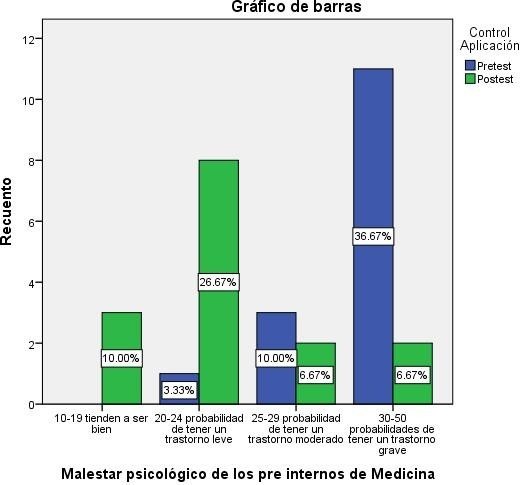 Como se muestra en la tabla de la (Chi-cuadrada de Pearson) se encontró significancia estadística, que de igual forma se refleja en el gráfico. Durante el pre test se encontró que un (36,67%) tenía probabilidades de tener un trastorno grave, posterior a la intervención disminuyó a un (6,67%). En probabilidades de tener un trastorno moderado un (10,00%), luego de la intervención disminuyó a un (6,67%), un (3,33%), incrementó después de la intervención a un (26,67%) en probabilidades de tener un trastorno leve, en tendencia a estar bien de cero pasó a un (10,00%) en el post test.