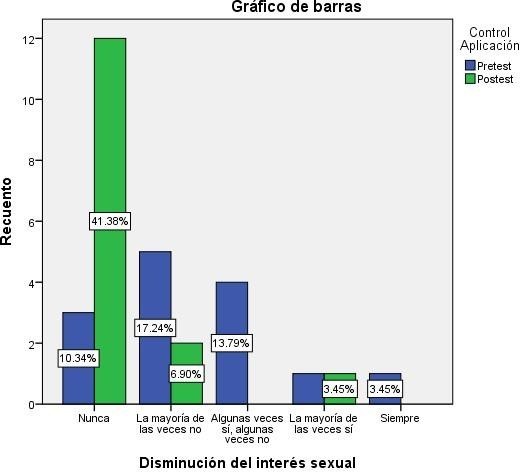 En el pretest, en disminución del interés sexual un (17,24%) dijo que la mayoría de las veces no, después de la intervención se redujo a un (6,90%), posteriormente un (13,79%) en algunas veces sí, algunas veces no, disminuyó a cero, un (10,34%) en la opción de respuesta nunca incrementó un (41, 38%), en la mayoría de las veces sí se mantuvo en un (3,45%) y la opción de respuesta siempre el (3,45%) disminuyó a cero. Existe significancia estadística (Chi-cuadrado de Pearson = 0.000 ≤ 0.020).
