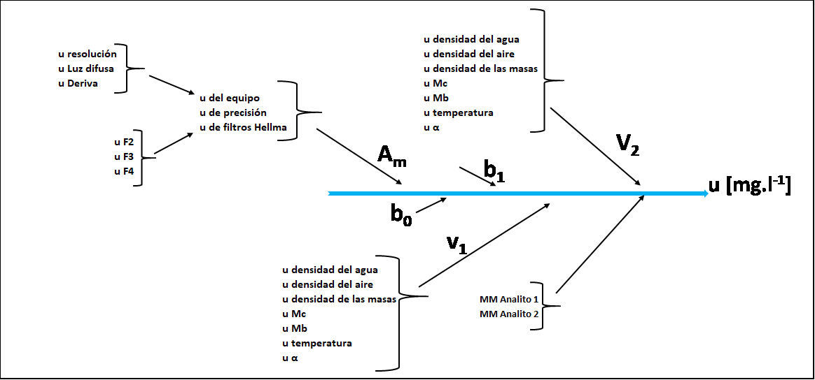 Para la metodología de Hierro Total y su naturaleza se estimó la incertidumbre por medio de la guía GUM y el modelo matemático de cuantificación de hierro total descrito por medio de la ecuación 1.