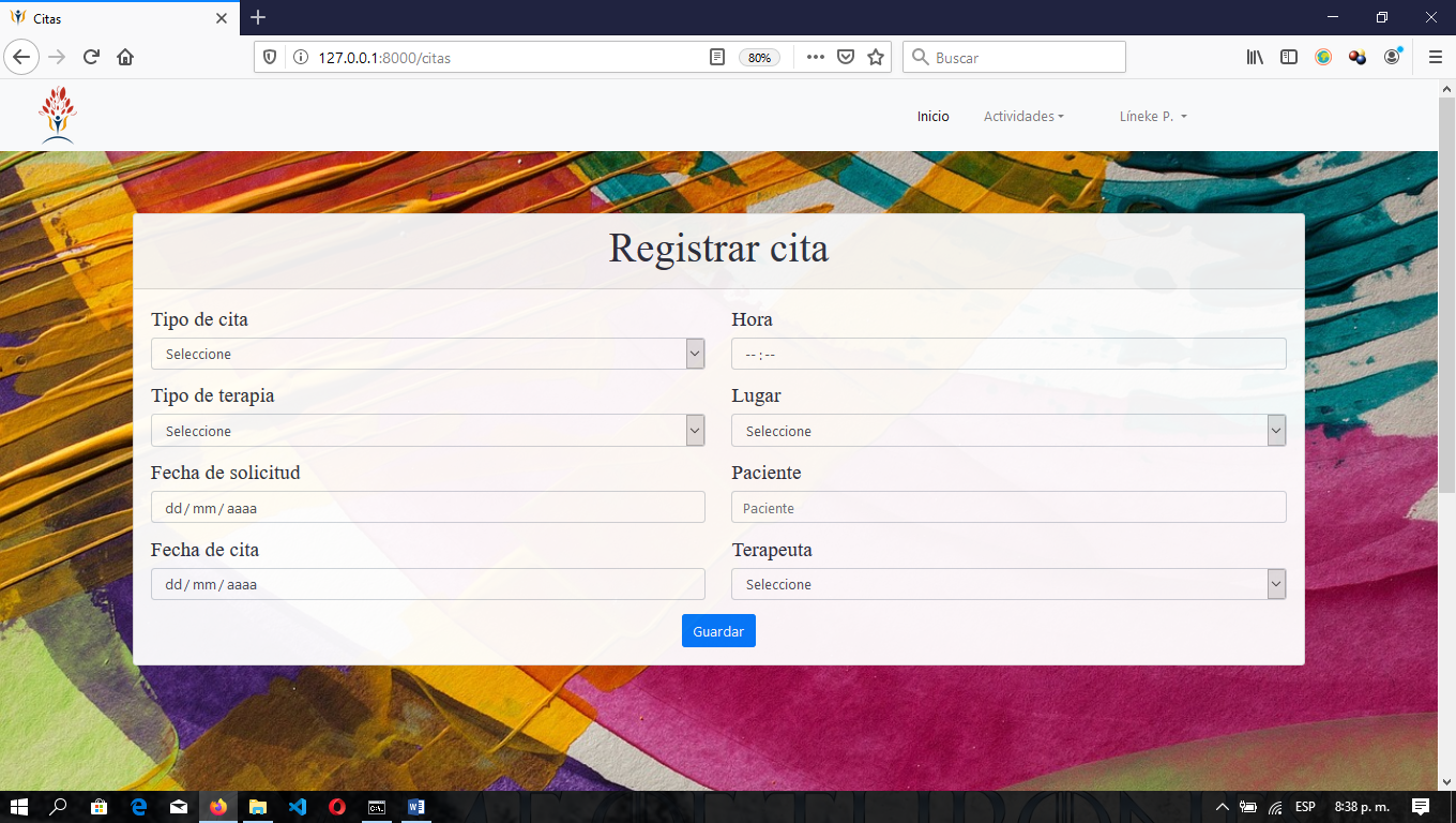 Se dio inicio al desarrollo de las vistas que corresponde a registro de paciente, cita, talleres y sesiones. En este espacio el terapeuta puede registrar a los pacientes que han solicitado una cita previa y acuden a la primera sesión o registrar una actividad, ya sea este taller, curso o capacitación en la vista talleres/cursos. Así como sus respetivas páginas de editar y enlistar los diferentes registros. Se muestran algunas imágenes como resultado de esta iteración: