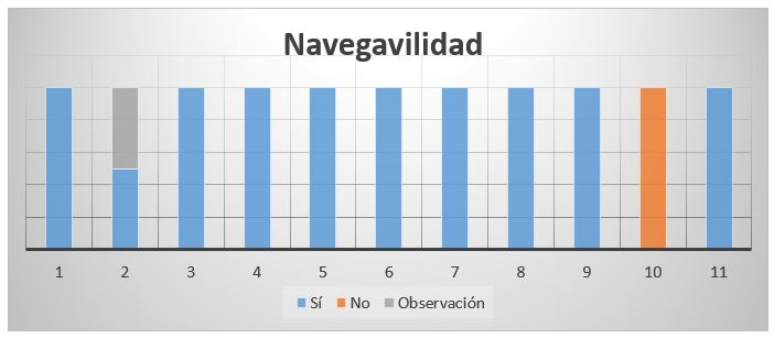El gráfico N° 2. Representa los elementos evaluados en cuanto a Navegabilidad, obteniendo en su mayoría afirmaciones positivas, una observación la cual se basa en crear notificaciones que permita saber si el terapeuta está ocupado por la hora o el sitio de la consulta que se desea ingresar. Una afirmación negativa donde describe que el sitio no ayudará a cualquier usuario con muy poca experiencia en la web.
