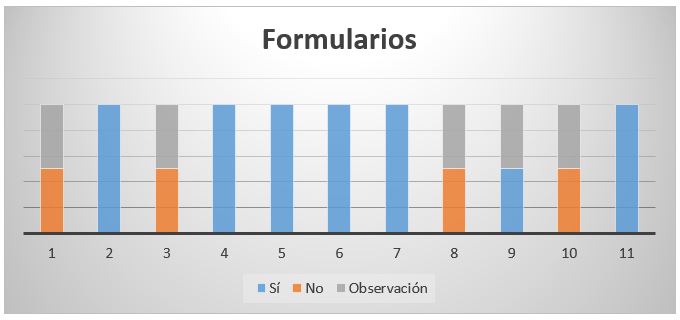 El gráfico N° 3. Representa los elementos evaluados en cuanto a Formularios, se hizo énfasis en 4 aspectos que resultaron negativos y sus debidas observaciones y es referente a los campos obligatorios y opcionales, que se notifique con un mensaje de alerta cuando un dato no fue completado.