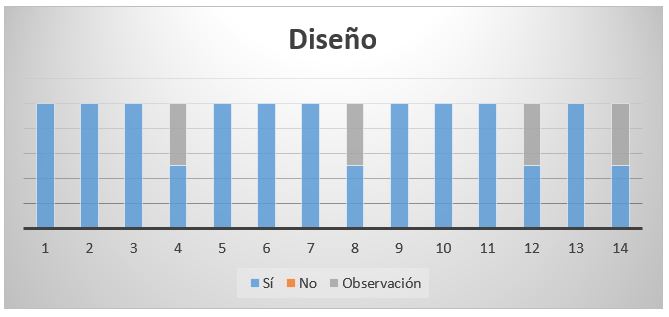 El gráfico N°4. Representa elementos evaluados en cuanto a Diseño, en lo cual se obtuvo la mayor parte respuestas positivas, y algunas observaciones como: cambiar los colores de fondo para que se permita leer claramente, sobre todo en formularios de entrevistas que son extensas, así como cambiar el tipo de fuente por una más grande y por último cuidar ítems repetidos.