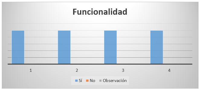 El gráfico N° 5 muestra los elementos evaluados en cuanto Funcionalidad, obteniendo en su totalidad respuestas positivas, terminándose la validación con comentarios muy positivos sobre el trabajo realizado y que las observaciones y aspectos negativos pueden ser mejorados con pertinacia.
