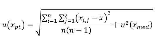 Para estimar el “valor asignado” para el ítem de ensayo de calcio y de magnesio, se utilizó el promedio de los resultados obtenidos por LACOMET y por el CIRA/UNAN-Managua. En el caso del CIRA/UNAN-Managua fue determinado a partir de los resultados obtenidos en una caracterización del ítem de ensayo con la técnica volumétrica y para el caso de LACOMET a partir de los resultados obtenidos en una caracterización del ítem de ensayo con la técnica por cromatografía de iones. Para ello, se midieron 10 ítems de ensayos por duplicado en condiciones de repetibilidad y el promedio de dichas mediciones fue designado como valor asignado del ítem de ensayo. Puede referenciarse la ecuación (5) para el valor asignado y la ecuación (6) para su incertidumbre.