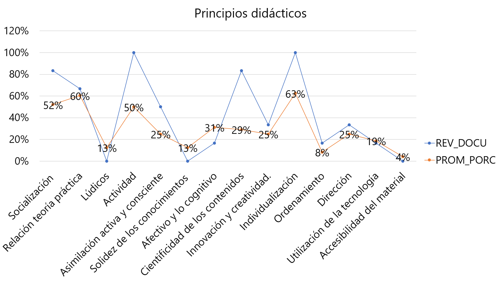 Se observa que hay una variedad de principios didácticos que son utilizados para la construcción del sistema de ejercicios a utilizar en el aprendizaje de la unidad de funciones matemáticas, en total son 14, pero como se mencionó anteriormente, solo cuatro tienen un promedio porcentual mayor o igual al 50% de utilización, estos son socialización, relación teoría práctica, individualización y actividad.