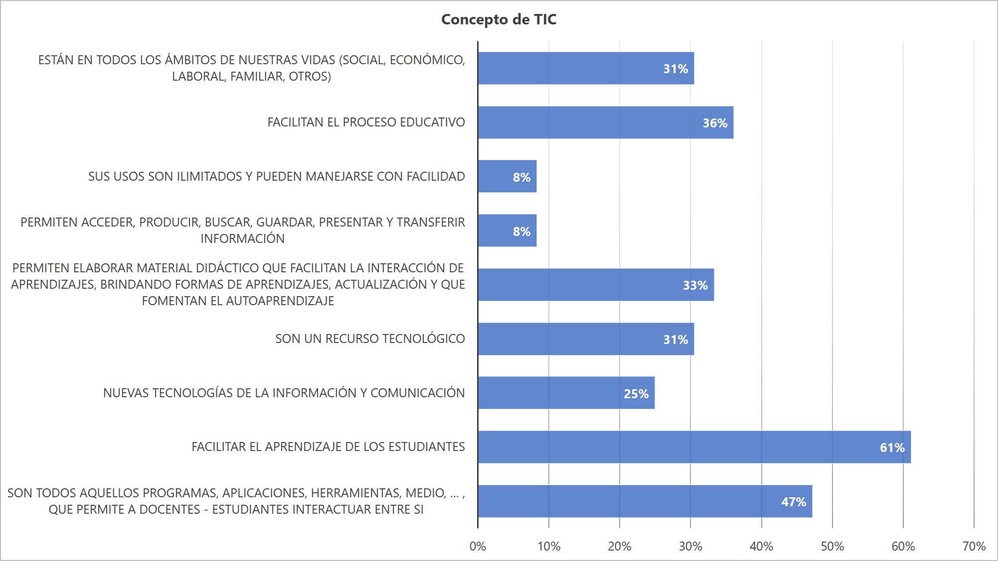 Con respecto al concepto de TIC, los datos expresaron que para los docentes, estas son: todos aquellos programas, aplicaciones, herramientas, medio, … , que permite a docentes - estudiantes interactuar entre sí, y además facilitan el aprendizaje de los estudiantes con una frecuencia (f = 4) que representa el 67%, consideran que son nuevas tecnologías de la información y comunicación frecuencia (f = 50), son un recurso tecnológico y permiten elaborar material didáctico que facilitan la interacción de aprendizajes, brindando formas de aprendizajes, actualización y que fomentan el autoaprendizaje con una frecuencia (f = 2) y permiten acceder, producir, buscar, guardar, presentar y transferir información, sus usos son ilimitados y pueden manejarse con facilidad, facilitan el proceso educativo, están en todos los ámbitos de nuestras vidas (social, económico, laboral, familiar, otros) con una frecuencia (f = 1).