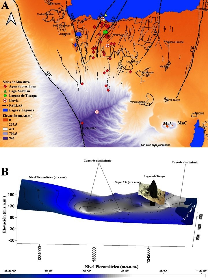 Figura 1. A) Ubicación del área de estudio y sitios de monitoreo de isótopos e hidroquímicos. B) Nivel piezométrico y representación del cráter de Tiscapa.