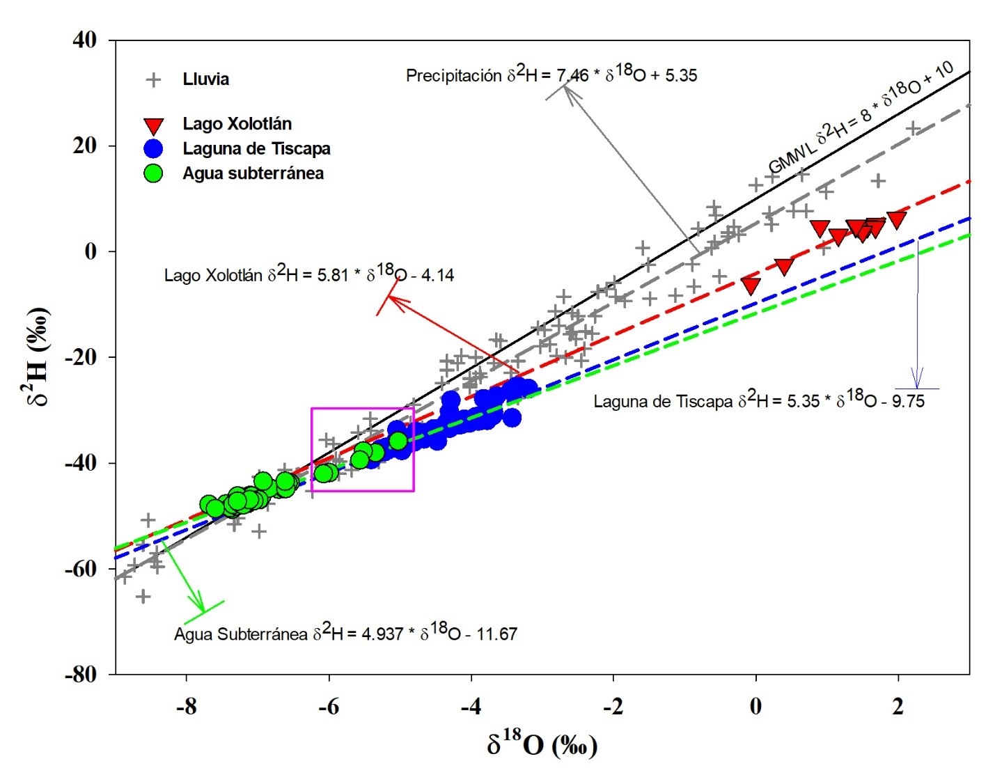 Los resultados de la composición isotópica se ilustran en Figura 2. La grafica de isotopos estables δ2H vs δ18O muestra correlaciones linéales correspondientes a Laguna de Tiscapa, agua subterránea, Lago Xolotlán y precipitación, junto a línea meteórica de agua mundial (GMWL por sus siglas en ingles). En el gráfico se observa alta variabilidad isotópica, donde se pueden distinguir tres agrupamientos o distinta composición isotópica en las fuentes de agua.
