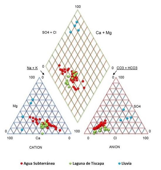 Figura 3. Diagrama triangular de Piper, color rojo agua subterránea, verde agua laguna de Tiscapa y azul agua de lluvia