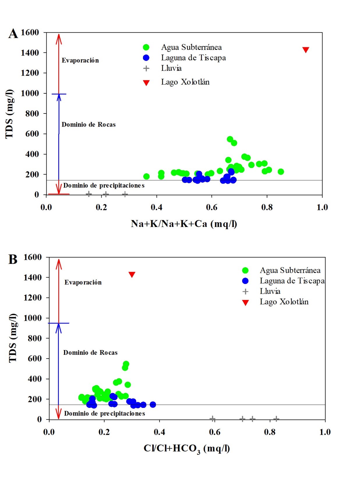 Figura 4. Gráficos agua subterránea, Laguna de Tiscapa y precipitaciones, siguiendo diagrama de Gips 1970. A) Cationes vs TDS. B) Aniones vs TDS.