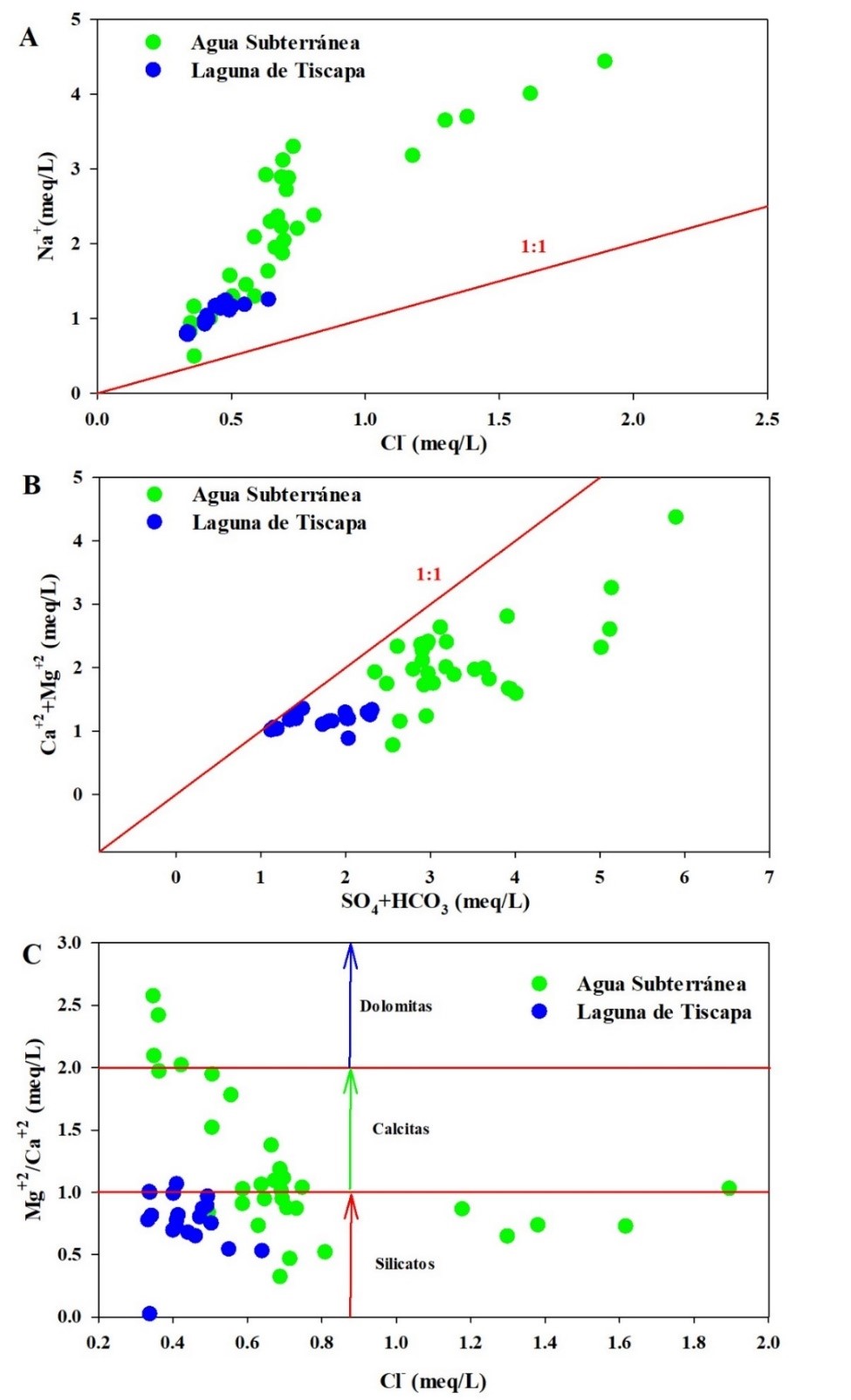 Figura 5. Relaciones hidroquímica, agua subterránea y Laguna de Tiscapa. A) Relación Cl- vs Na+. B) SO4+HCO3 vs Ca+2+Mg+2. C) Cl-vs Mg+2/Ca+2