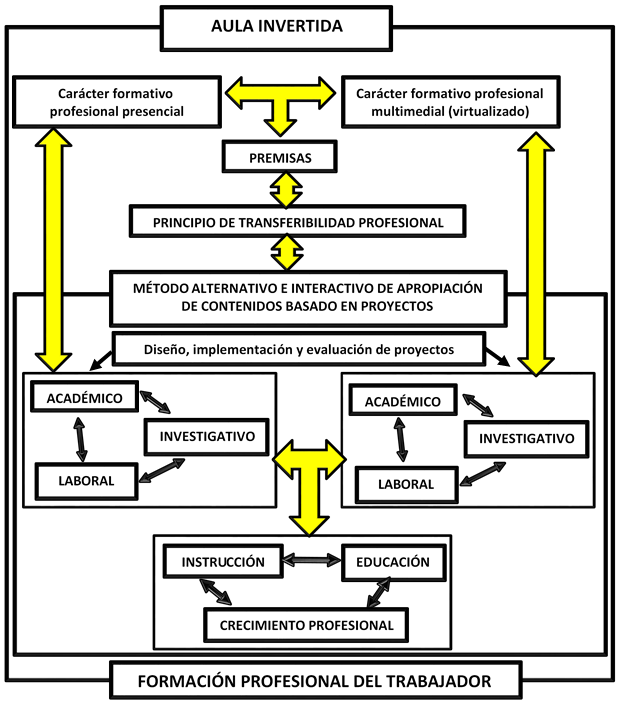 En el aula invertida para la formación profesional de los trabajadores, la combinación que se realice entre lo presencial y lo multimedial, presupone un adecuado tratamiento a la formación de un trabajador competente, que posea una cultura general e integral, social, económica – productiva. Es necesario atender las diferencias individuales de los estudiantes y concebir proyectos de formación, con visión actual y prospectiva, en una interactividad tecnológica (con entornos virtuales de aprendizaje profesional), que vinculen la docencia, lo laboral e investigativo, asociado a la innovación tecnológica. Lo antes expuesto, hace pertinente reconocer desde la didáctica de las ciencias técnicas, a las relaciones que se producen entre lo instructivo, lo educativo y el crecimiento profesional del trabajador.