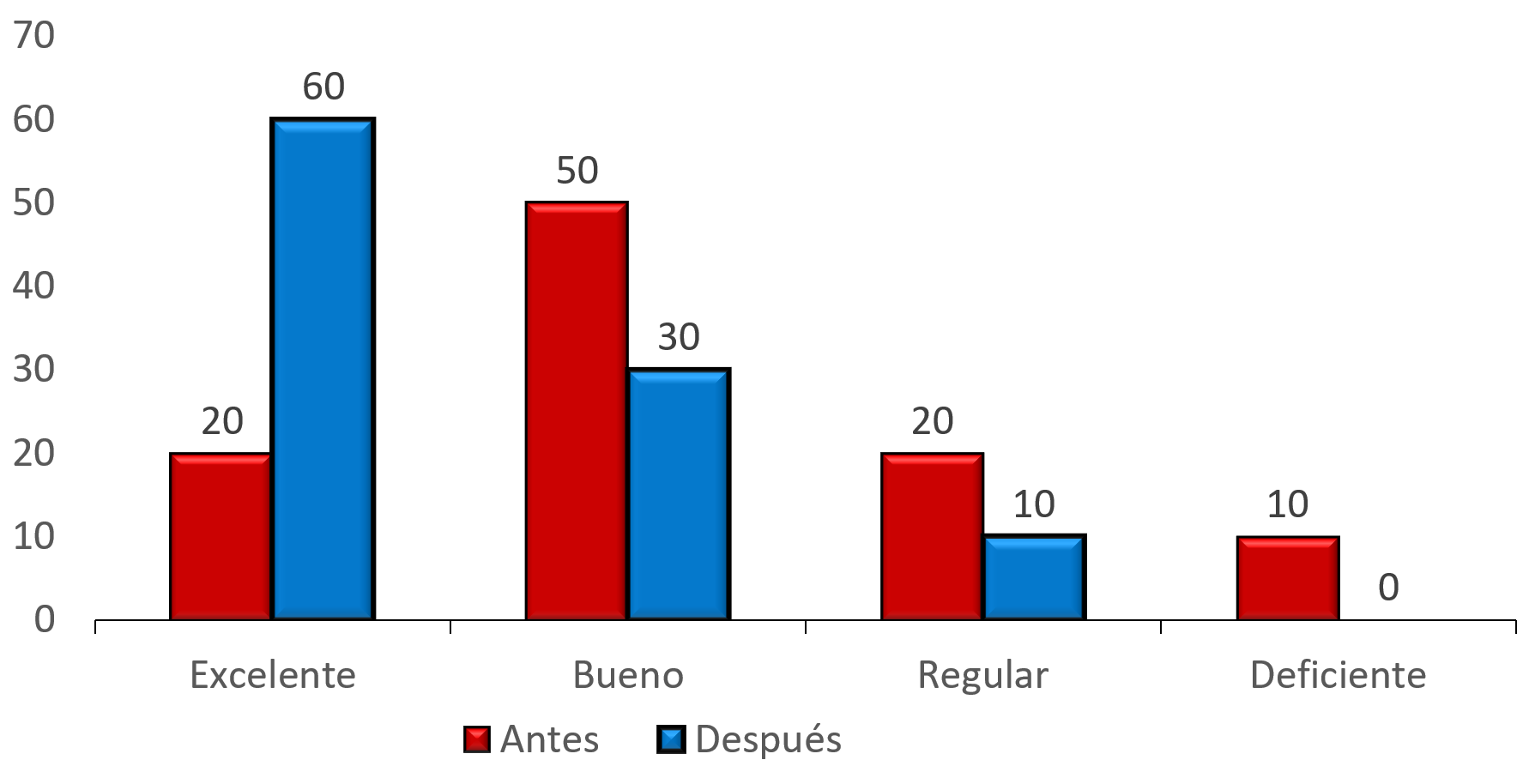La concepción didáctica se implementó durante el año 2019 en una muestra de 100 estudiantes de las carreras de Ingeniería Mecánica, Construcción Civil y Medicina. Se realizaron talleres de preparación a los docentes de las carreras que intervinieron en el pre-experimento y posteriormente estos implementaron la concepción didáctica contextualizada en los tres grupos de estudiantes conformados para cada carrera, con flexibilidad, durante un semestre formativo. En el siguiente gráfico se muestra el cómputo total de datos registrados, mediante la observación directa en el terreno del desarrollo de las competencias profesionales de los estudiantes, antes y después de aplicada la concepción didáctica de aulas invertidas para la formación profesional.