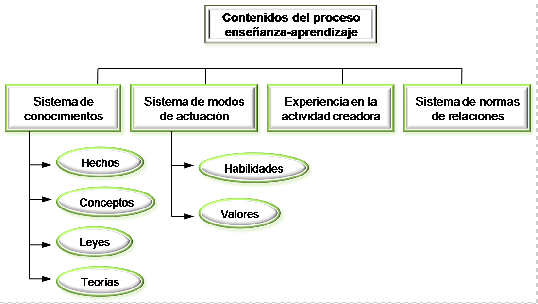 Cumple funciones instructivas, educativas y desarrolladoras. Addine (1998), considera que es el elemento objetivado del proceso y responde a la pregunta: ¿Qué enseñar-aprender? Es aquella parte de la cultura y experiencia social que debe ser adquirida por los estudiantes y se encuentra en dependencia de los objetivos propuestos. Constituyen las máximas generalizaciones que expresan el sistema de conocimientos, los métodos y las técnicas de trabajo de la asignatura. Para la apropiación de cada idea rectora los alumnos deben dominar el sistema de conceptos y habilidades (figura 2).
