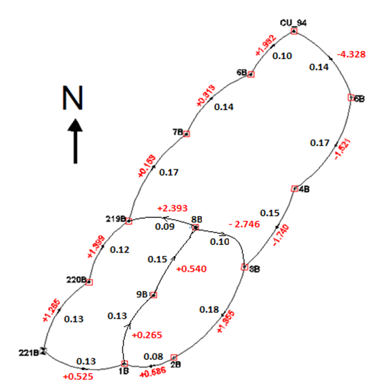 Resultados obtenidos de las mediciones en la red Altimétrica con el nivel ya corregidas se muestran en el croquis de la nivelación realizada en el área del polígono patrón. (Fig.1.3)