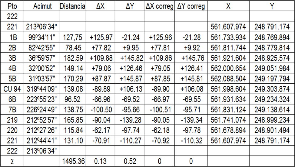 Después de haberse ejecutado estas labores en el campo se pudo comenzar a gestionar estos datos para el trabajo de gabinete calculando las coordenadas (tabla 1.1)