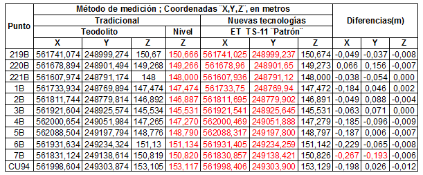 Luego de calcular las coordenadas de las mediciones realizadas con equipos tradicionales se procedió a comparar dichas mediciones con las coordenadas patrones obtenidas por el TS-11 de alta confiabilidad verificando así la calidad de la labor ejecutada. Observando que en el punto 7B en las coordenadas de las X e Y apreciándose la diferencia más notable de X: 26,7 cm Y: 19,3 cm. Los resultados se sintetizan en una base de datos (x, y, z) en el polígono patrón, facilitan el trabajo de docentes y estudiantes, así como los futuros proyectos en el área de estudio.