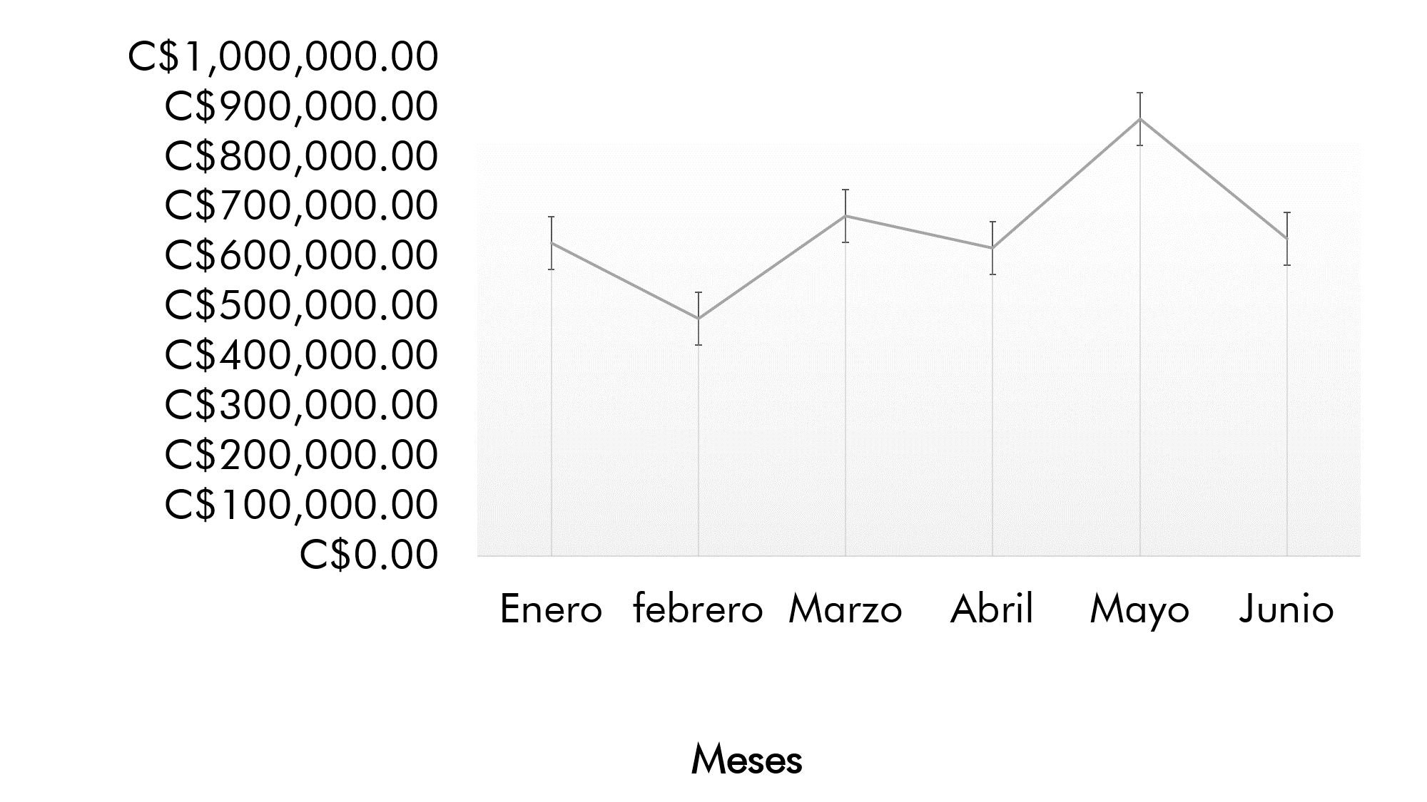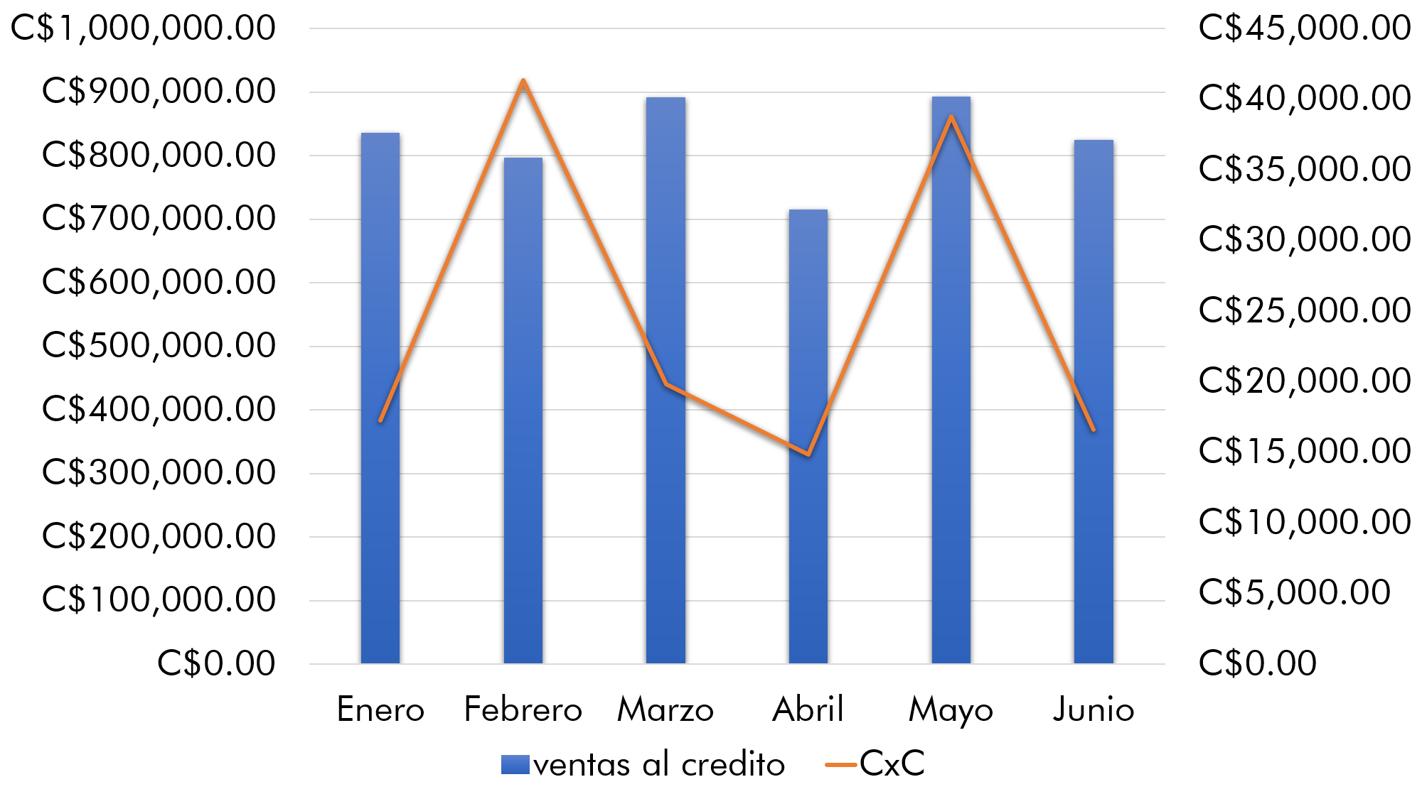 Como se puede observar las cuentas por cobrar generalmente aumentan cuando el nivel de ventas es mayor a C$800,000.00 córdobas, aunque en los meses de marzo y mayo se incrementaron las ventas.