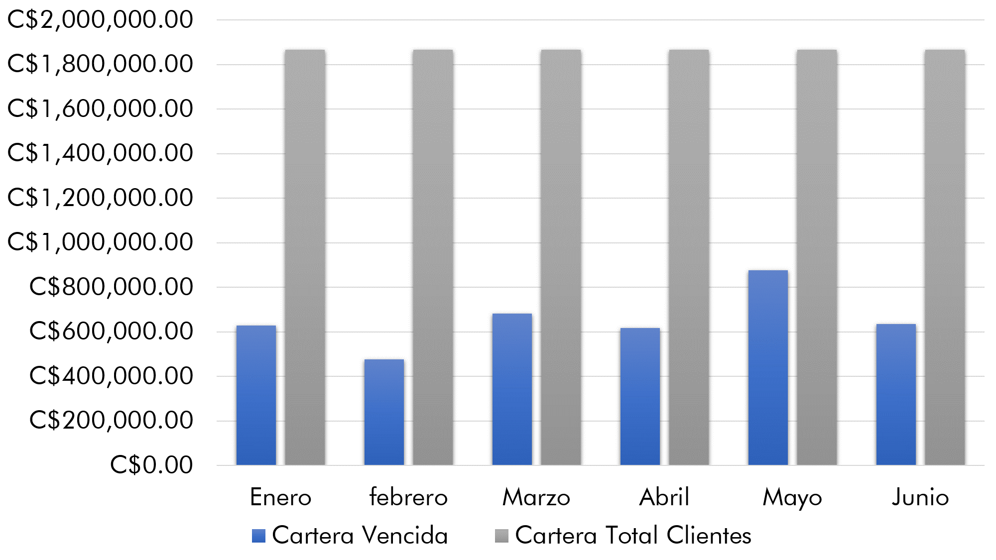 Para poder realizar este comparativo se dividió C$11,201,452.00 / 6, para así lograr una estimación de la cartera otorgada por mes, ya que este dato no se pudo obtener de manera detallada.
