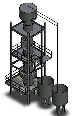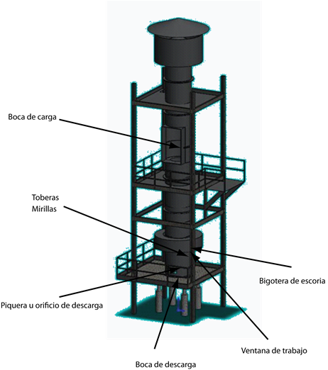 La estructura metálica del cubilote consiste en un cilindro vertical, formado por planchas de acero soldadas de 6 mm a 13 mm de espesor, montadas por secciones sobre una plancha base, que a su vez es soportada por cuatro columnas de apoyo, las cuales están fijadas al cimiento (Sánchez-Figueredo, 2016). En la Figura 1 se muestra una representación gráfica del Horno de cuba alta discontinuo de 700 mm de diámetro de trabajo (HCAD700) de la Empresa Mecánica de Holguín.