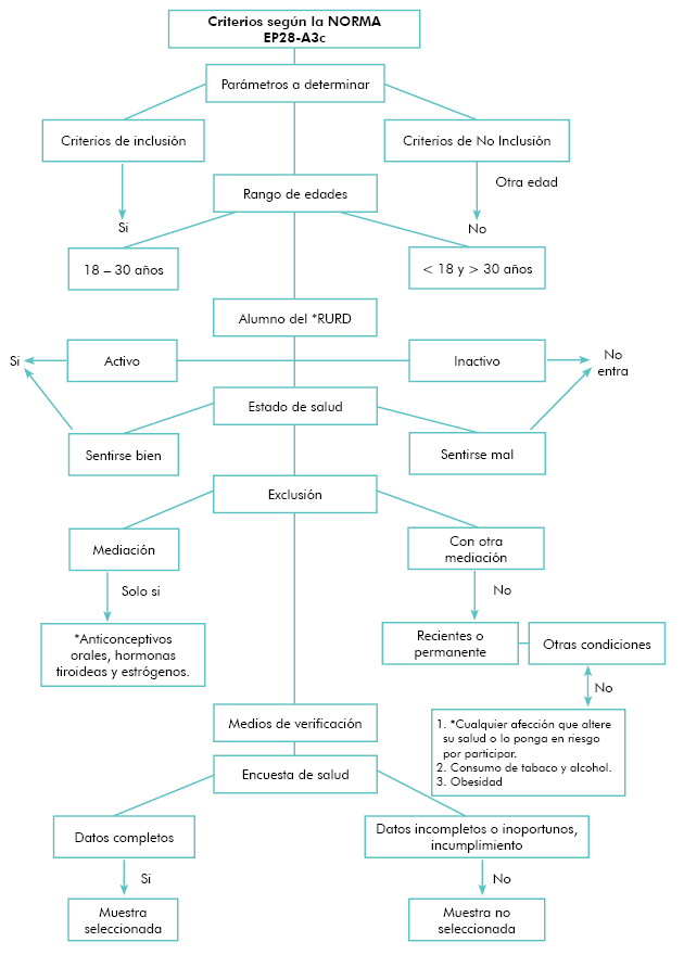 De acuerdo a los criterios reflejados en el flujograma, al aplicar la Norma EP-28A3c uno de los parámetros fue la edad de 18-30 años , ya que en esta edad es donde menores eventos de salud se espera encontrar y el organismo mantiene un estado homeostático adecuado que no se afecta intensamente por factores externos o ambientales, el joven responde bien a los cambios de temperatura, de alimentación, se adapta a los influjos de carga de trabajo es multiadaptativo en cuanto a las horas de sueño, actividades recreativas, horas que dedica al estudio etc.). Si la persona no cumple los criterios de edad fue clasificada como criterio de no inclusión y no participa.