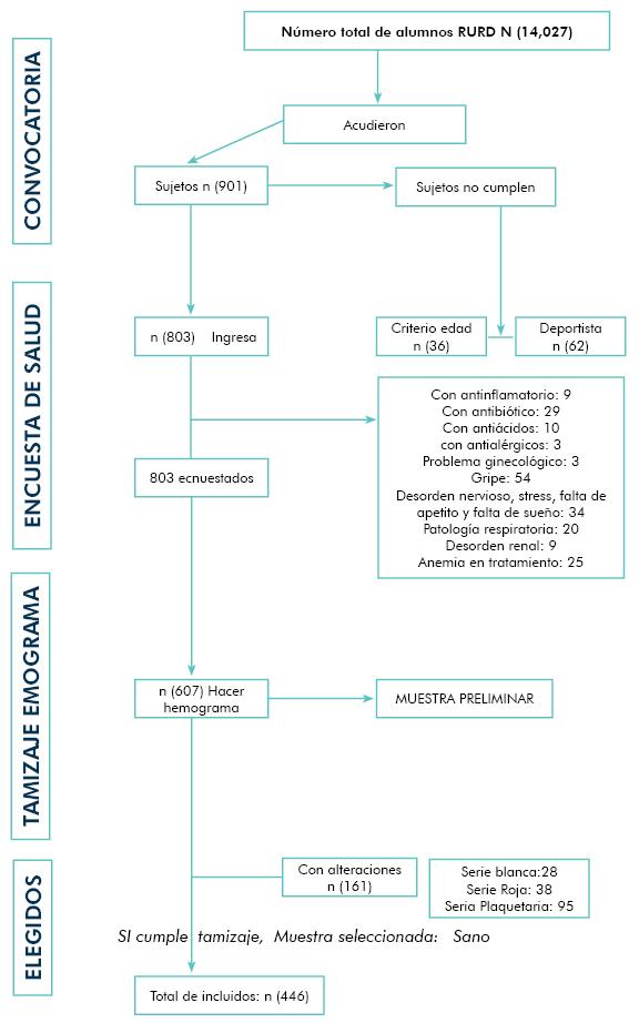 The selection of research subjects is determined by 3 factors, the first related to the researcher’s criteria according to the objectives, the second established by the inclusion criteria that define exactly who enters the study and the third by exclusion criteria that define why some subjects do not meet the mandatory requirements. The objective was to describe the experience in order to obtain a reference sample according to inclusion and exclusion criteria, taking as a model some aspects suggested by the EP 28-A3c standard while maintaining the rigorousness criteria of the research. This was a descriptive, cross-sectional study conducted at the Rubén Darío Campus (RURD) of the National Autonomous University of Nicaragua, Managua UNAN-Managua Nicaragua. Two phases were carried out: The first consisted of an open convocation and the second consisted of a clinical evaluation plus blood screening. The health survey was designed based on the EP 28-A3c standard. The health survey and blood screening was the instrument used to select the students to obtain the sample. The main results were: of 901 (100%) students who responded to the invitation, 607 (67.4%) met the selection criteria, distributed by sex: 340 (56%) females and 267 (44%) males. The 196 (32.3%) students were excluded at the clinical evaluation stage for presenting current medication 17.6%, recent consultation 12.03%, gynecological problems 10.48%, anemia 6.43%, abnormal blood pressure 5.72%, obesity 4.6%, consume of alcohol, tobacco or drugs 1.19% among others. An objective and successful result was obtained to obtain the sample selection through the application of standard EP 28-A3c, which allowed establishing selection criteria that guarantee the minimum of biological bias, increasing the validity and confidence of the study.