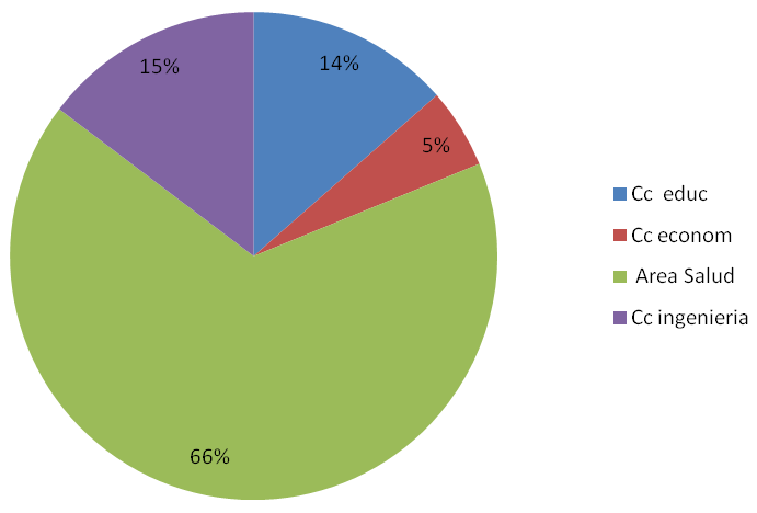 Del total de alumnos matriculados en el período de estudio acudieron 901 estudiantes voluntarios al laboratorio, se sometieron a entrevista 803 estudiantes, (89%) de los mismos ya que el 11% no llenó los criterios de edad (4%) y ser deportistas (7%), firmaron el consentimiento informado y se trasladaron a la sala de encuesta de salud, para la evaluación. De los 803 estudiantes solamente 340 enunciaron la facultad a la que pertenecen equivalente al 42.34%. El estudiante se reservó el derecho de no mencionar su facultad de origen esto es comprensible como parte de las consideraciones éticas inherentes a toda investigación con seres humanos. Pero un dato muy importante fue la participación activa de estudiantes de carreras afines al sector salud con un 66% (ver figura 1). También es importante mencionar que el programa de Universidad Saludable de la Universidad contribuyó a motivar la participación en el estudio.