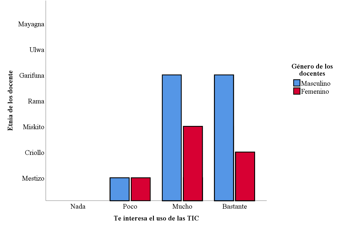 La figura 1 muestra la distribución de los docentes de acuerdo al grado de interés en el uso de las Tecnologías de la Información y la Comunicación (TIC, en adelante). Es importante destacar el predomino de los hombres y, en menor, grado las mujeres. Se observa también que, de este grupo de docentes, quienes muestran mayor interés, son aquellos que pertenecen a las etnias garífuna y mískitu. Los de la etnia mestizo son los que menos interés muestra ante el uso de las TIC.