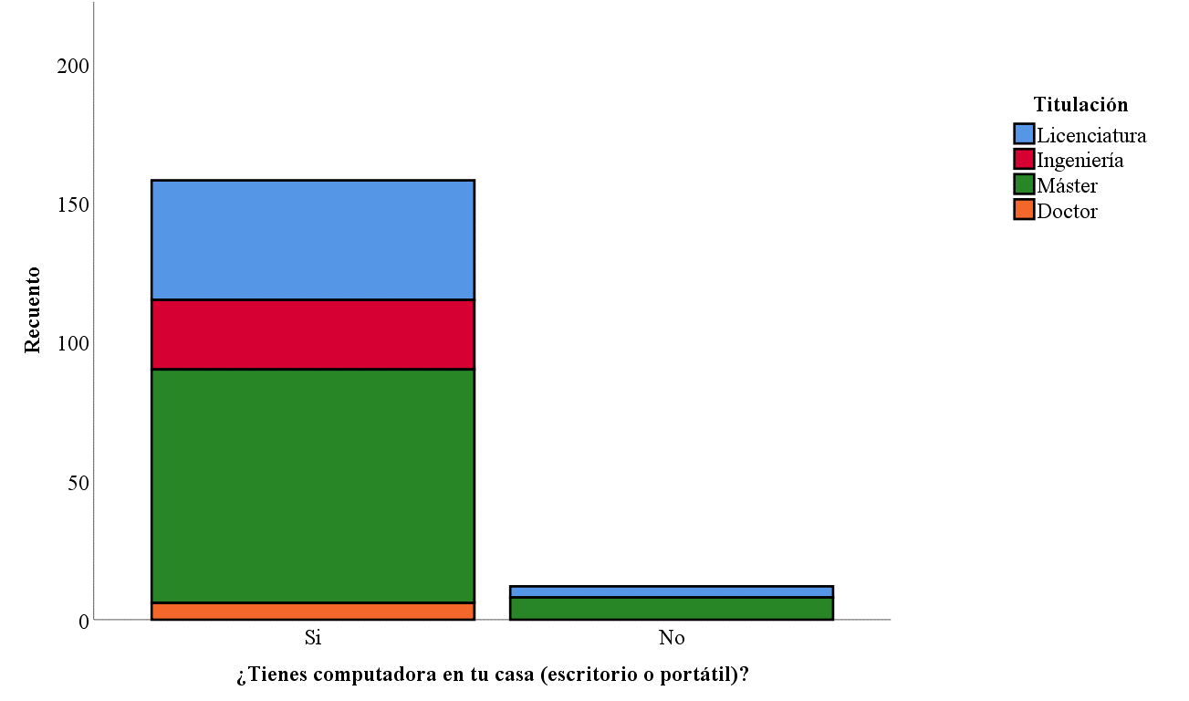 Con los datos reflejados de la figura 2, se observa que, a mayor nivel académico, hay más oportunidad por parte de los profesionales, independientemente de su profesión, de adquirir una computadora para dar respuestas a las demandas tecnológicas que surgen en sus actividades laborales. Este grafico nos muestra que, evidentemente, esta suposición es verdadera, al menos, en este contexto, dado que la mayoría de los docentes si poseen una computadora, sea portátil o de escritorio.