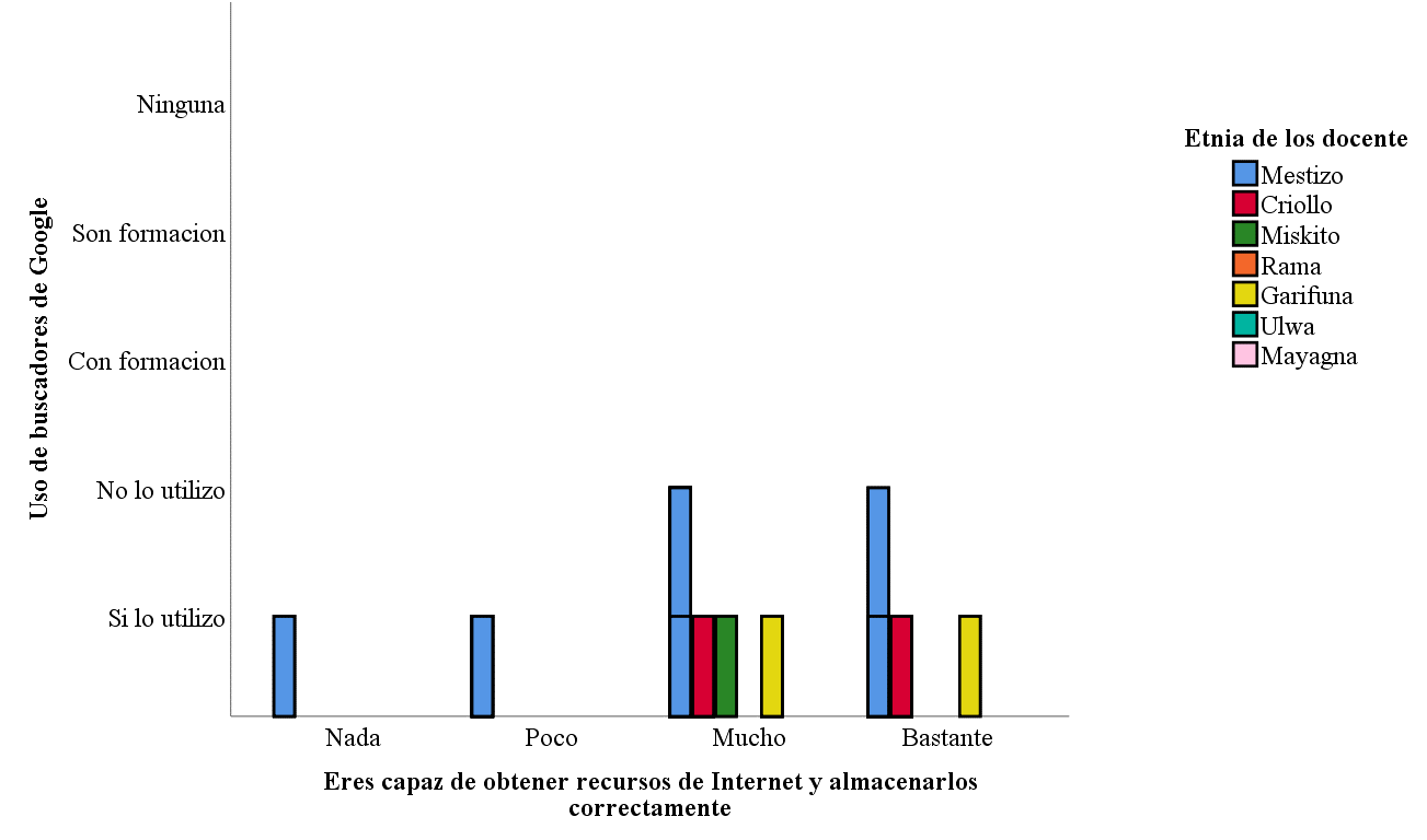 Se realizó una agrupación de tres variables (figura 4), encontrando que, a diferencia de los datos obtenidos en gráficos anteriores, se observa que los docentes que hacen más uso de las TIC, son los que pertenecen a las etnias garífuna, mískitu y criollo, a pesar de que, dentro de la muestra seleccionada, hubo mayor participación de la etnia mestiza. Es significativo el hecho de que las docentes expresen sentirse capaces en el uso de buscadores para gestionar la información que utilizan para reforzar su actividad profesional. No obstante, hay una cantidad de docentes de la etnia mestiza que dicen no utilizar el buscador, aunque si dicen sentirse capaces de realizar esta tarea. De igual manera que al gráfico anterior, se refleja que los docentes expresan no haber recibido formación alguna en el manejo de esta herramienta.