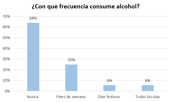 | P8 | ¿Con qué frecuencia consume alcohol? | 64% nunca, 24% fines de semana, 6.% días festivos, 6% todos los días. |