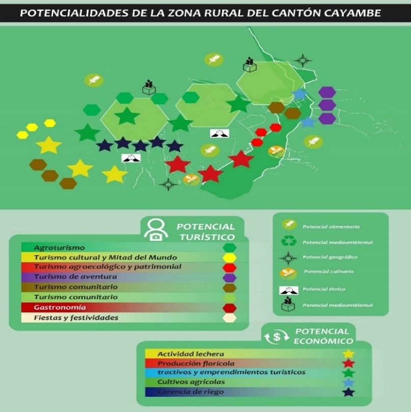 A continuación se presenta los mapas de las tres zonas de estudio en las cuales ser representa gráficamente las potencialidades obtenidas por entrevistados a través de la codificación abierta, selectiva y axial. Cada uno de estos mapas demuestre como se encuentra configurada metodológica y empíricamente las siete potencialidades halladas. Siendo estos mapas y sus representaciones descritas en cada una de las matrices de contenida el resultado producto del trabajo en campo realizado con la comunidad del cantón Cayambe.